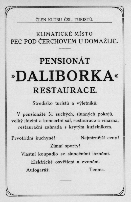 Na přelomu 19. a 20. století panoval na Chodsku čilý turistický ruch. Díky železniční trati z Prahy do Brodu nad lesy (dnešní německý Furth im Wald) přijíždělo hlavně v létě do kraje pod Čerchovem mnoho návštěvníků z různých koutů Čech.